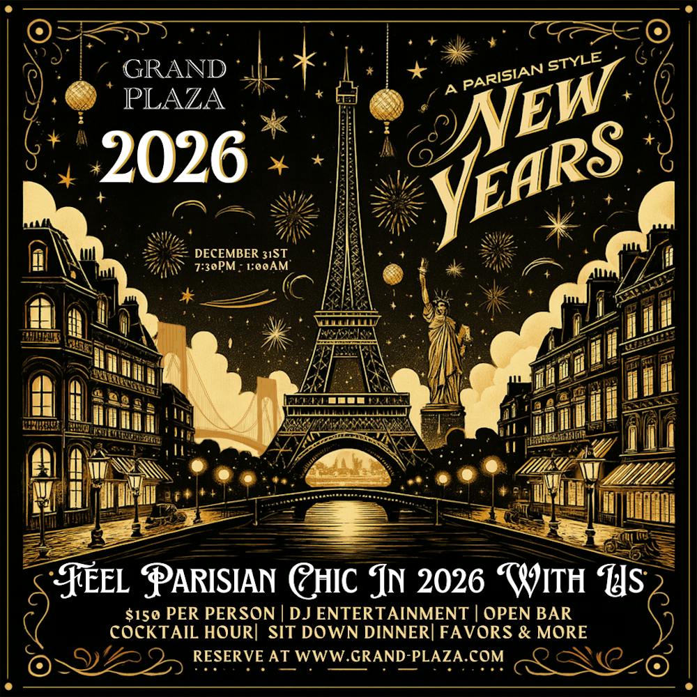 πΊπ Step into a night of luxury at Grand Plaza's Parisian Style Gala! Join us on December 31st at 7:30 PM to celebrate New Year's Eve with DJ entertainment, an open bar πΈ, and a cocktail hour π½ that leads to a fabulous sit-down dinner. Dress up with a hint of gold β¨ to match the glamour of the evening! Enjoy party favors π, free parking π, and a celebration that will leave you glowing. RSVP & we'll See you there!